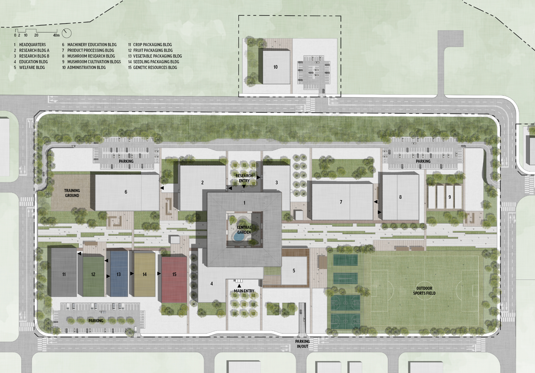 Program: Clusters for research, education, and administration facilities aimed at preserving and transmitting agricultural technology, agricultural product processing facility, packaging management facility, community and welfare amenities, and an outdoor sports field.