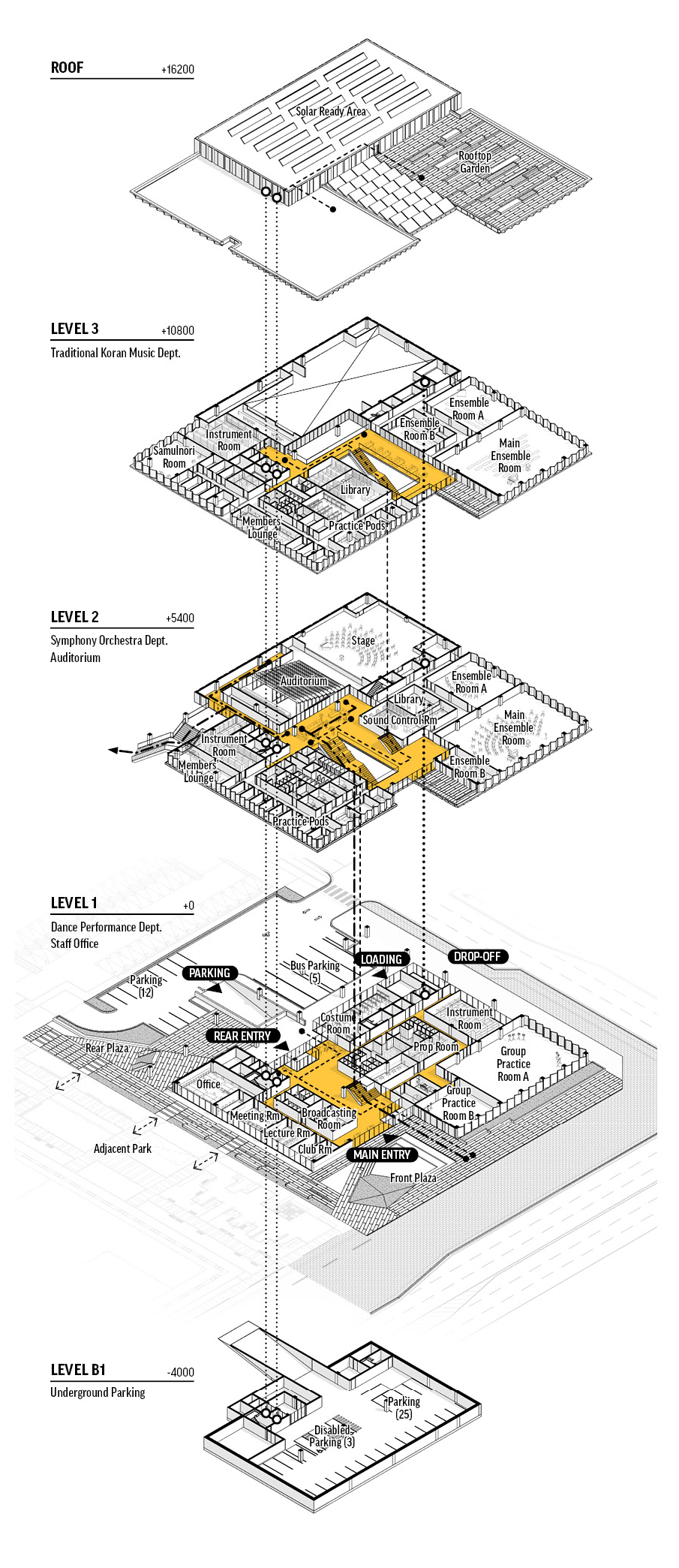 Each facility for the arts groups is designed as a platform optimized for their respective needs, accommodating various formats of archiving, creation, and practice. These platforms are intended to work together seamlessly, creating an environment where they complement each other organically. The building's exterior, which visualizes the dynamics of sound and rhythm, reflects the people who create music and art, making music itself the façade and a new symbol of Gyeongsangbuk-do.
