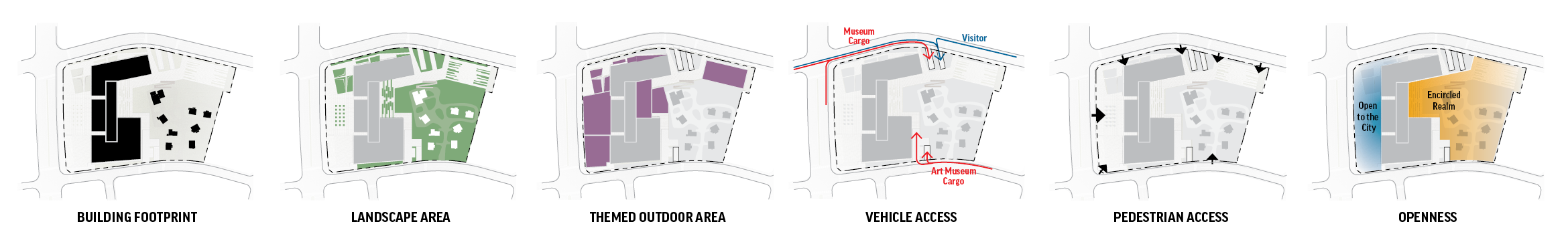 The Problem given to us was to find a way to organically connect the three independent buildings, The existing OCI Factory Office, Municipal Museum, and Art Museum, with continuity while maintaining their unique identities. We solved this architecturally by penetrating the elongated Big Podium so that all three buildings are in contact. The Big Podium is large enough to allow direct access to multiple levels of the building, contains common programs, and serves as an index throughout the facility. Hugeness itself has symbolism and provides the volume to hold urban events.