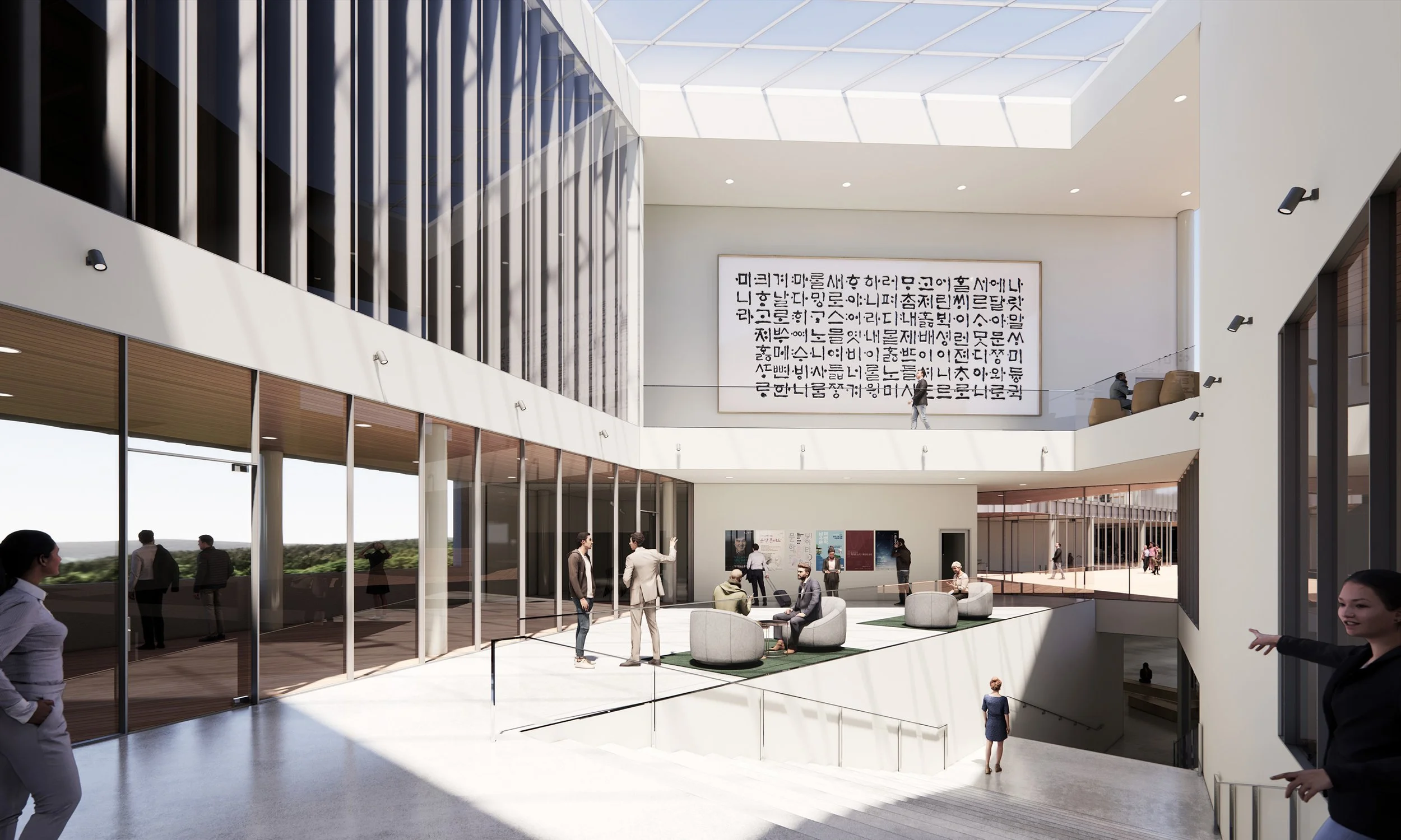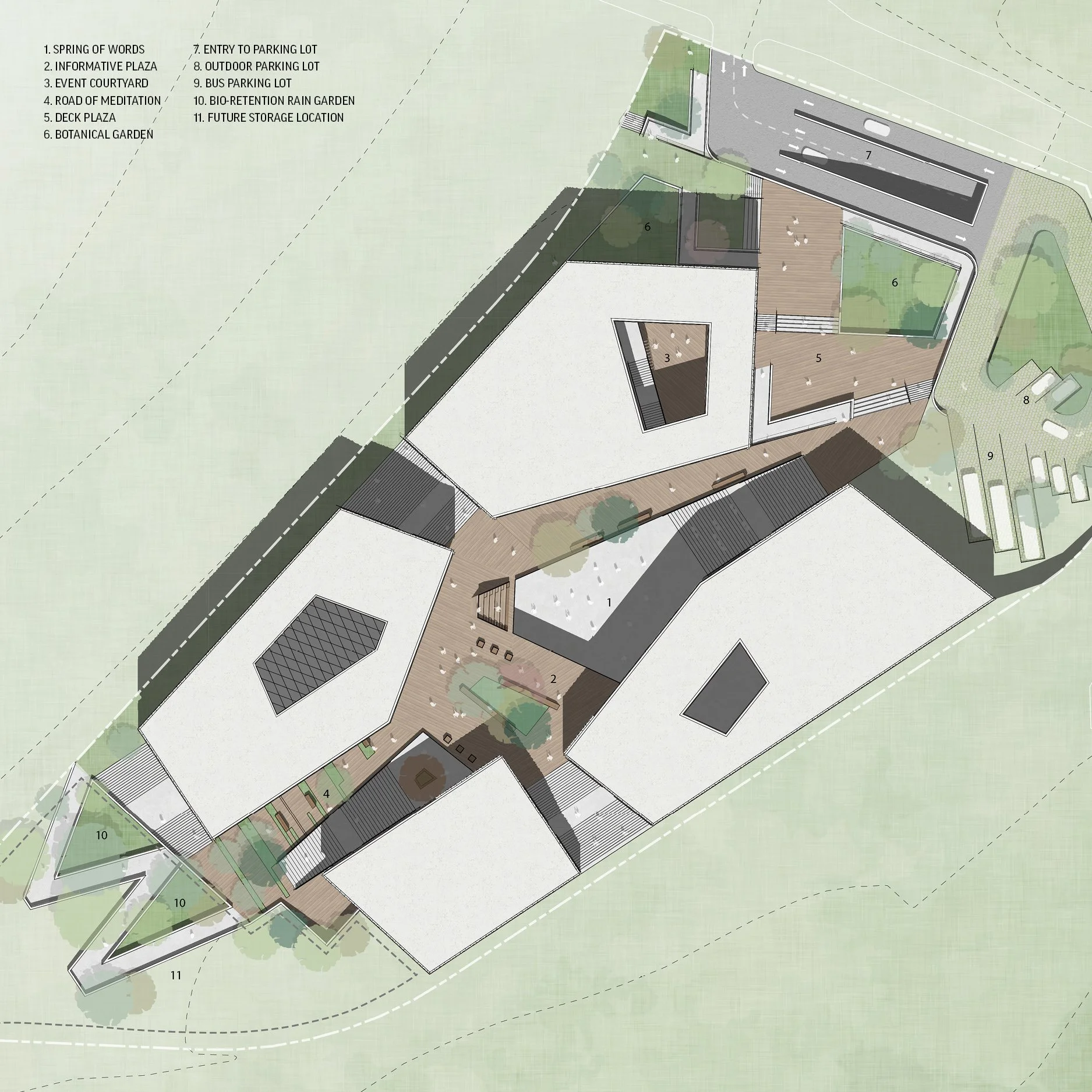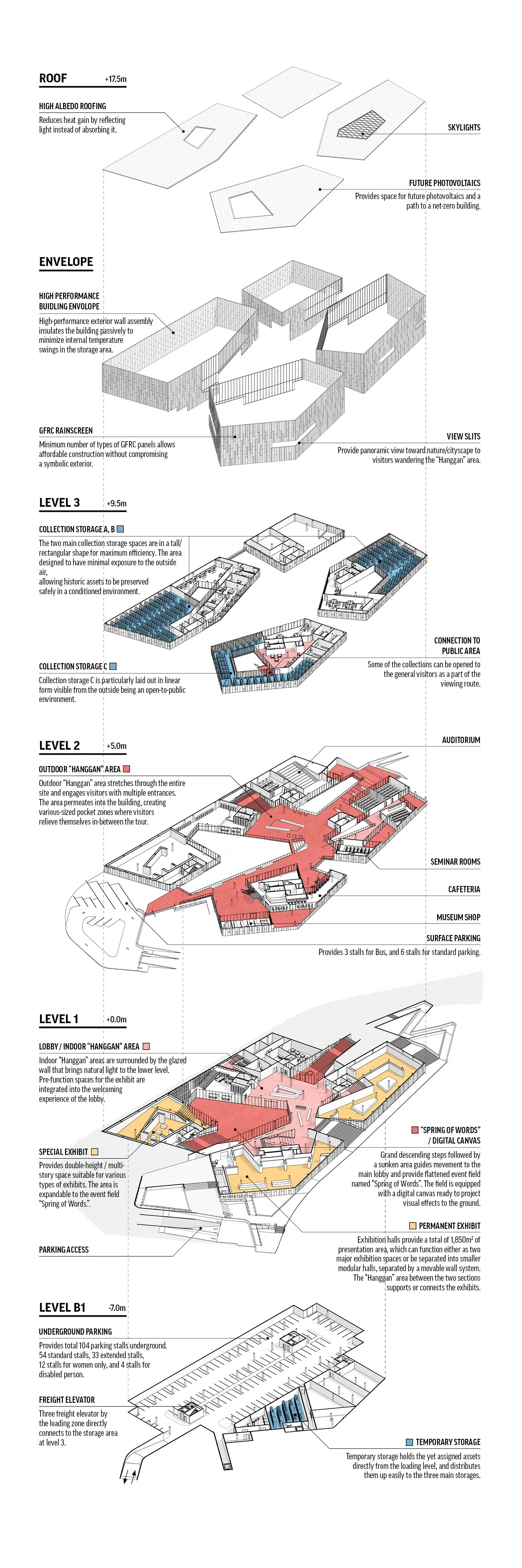 Architectural Hanggan is created by splitting and moving the building volume outward leaving the center hollow. The Hanggan area stretches through the entire site and engages visitors with multiple entrances. The area permeates into the building, creating various-sized pocket zones where visitors relieve themselves in-between the tour. Floating up the collection storage enables barrier-free movement at the Hanggan level. Grand descending steps followed by a sunken area guides movement to the main lobby and provide a flattened event field named “Spring of Words.” The field is equipped with a digital canvas ready to project visual effects to the ground.